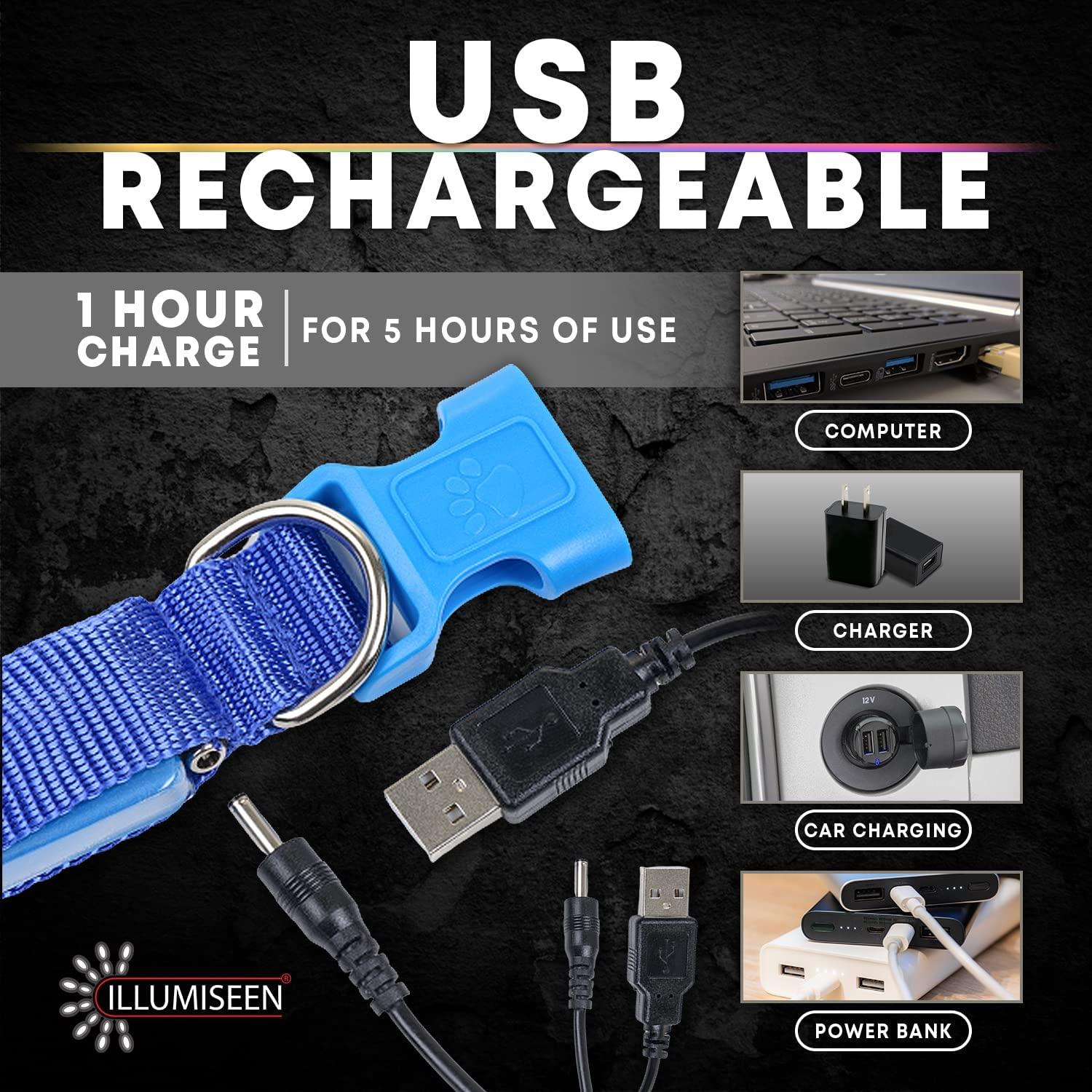 DOG PROOF AND WEATHER-PROOF 100% GUARANTEED ? if your dog is rough with collars, worry-not. Illumiseen LED dog collars are built to last and come with a lifetime guarantee. Simple to use clip, adjustable and weather resistant. 6 BRIGHT COLORS & 6 DIFFERENT SIZES ? comes in 6 different bright and vibrant colors and 6 different sizes so you know you will get the perfect fit. Change the light between steady mode, rapid flashing or slow flashing with just 1 click. RECHARGEABLE BATTERY THAT LASTS MULTIPLE WALKS ? the USB rechargeable battery (cable included) gives 5 hours of illumination per 1 hour charge. A charge that will last multiple walks. No hassle with replacing batteries and no extra costs. HIGHEST VISIBILITY ? unlike others, our LED dog collars provide the highest visibility and are built to last so your dog will be seen in the dark well in advance, providing protection from vehicles and other unexpected dangers during night walking. Perfect for use with Illumiseen matching dog leashes. SAVE YOUR DOG?S LIFE ? this collar will save your dog?s life by keeping it visible, safe and seen. This bright lighted LED collar provides the ultimate safety for your dog and allows for the highest visibility in all conditions at all times.Best Sellers Rank: See Top 100 in Pet Supplies. Item Dimensions LxWxH: 24.8 x 0.98 x 0.59 inches. Closure Type: Buckle. Brand: Illumiseen. Color: Neon Green. Pattern: Dog. : B00UAINMMK. Manufacturer: Illumiseen. Date First Available: March 5, 2015. Batteries: 1 Lithium Ion batteries required. Item model number: LED-Hundehalsband. Product Dimensions: 24.8 x 0.98 x 0.59 inches; 1.06 Ounces. Is Discontinued By Manufacturer: No.