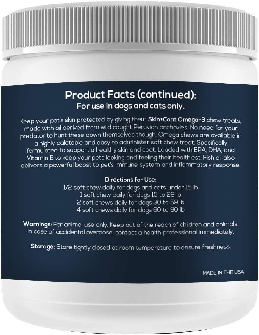 Keep your pet’s skin protected by giving them skin-coat Omega-3 fatty acid chew treats, made with oil derived from wild caught Peruvian anchovies. No need for your predator to hunt These down themselves though. Omega chews are available in a highly palatable and easy to administer soft chew treat. Specifically formulated to support a healthy skin and coat. Loaded with EPA, DHA, and vitamin E to keep your pets looking and feeling their healthiest. Fish Oil also delivers a powerful boost to pet’s immune system and inflammatory response.PROUDLY MADE IN THE USA: Manufactured right here in the USA. Crafted in small batches to ensure quality and freshness. WILD CAUGHT PERUVIAN ANCHOVIES: Made with the finest ingredients inclusive of oil from wild caught Peruvian anchovies. Enjoy the benefits of supplying your dog or cat with fish oil, minus the mess of a liquid. IMMUNE & INFLAMMATORY SUPPORT: Specially selected ingredients support immune function, while also lubricating hip and joints to encourage mobility for dogs that may live with symptoms of pain and stiff joints. SUPPORT SKIN & COAT: Specifically formulated with jungle pets in mind to support skin and coat health. Rich with omega-3 fatty acids. Chewable treat form makes administration a breeze! Dogs and cats will be lining up to get theirs. CAT & DOG COAT SUPPLEMENT: Anti shedding fish oil chews help your Jungle Pet ditch the itch and maintain a smooth, soft and shiny coat and keeps the skin moisturized.Best Sellers Rank: See Top 100 in Pet Supplies. Target Species: Cat,Dog,Fish. Flavor: Bacon. Brand: Jungle Pet. Item Form: Chew. Country of Origin: USA. : B07KS25LXQ. Manufacturer: Jungle Pet. Date First Available: February 21, 2019. Item model number: JP1087. Product Dimensions: 4 x 4 x 4 inches; 13.62 Ounces.